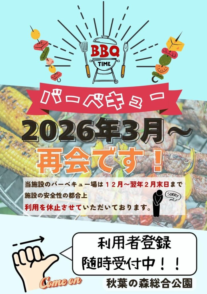施設の安全の都合上、12月1日〜2月末まではバーベキュー場の利用を休止いたします。 3月以降のご予約につきましては、以下のページから詳細をご確認ください。 https://saitama-park.co.jp/reser […]