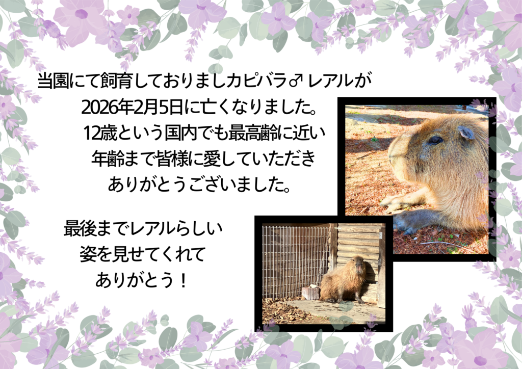 大崎公園で飼育されていたカピバラ(オス)のレアルが 2026年2月5日に死亡しました。 これまでレアルを温かく見守ってくださった皆様に、心より感謝申し上げます。 【受付時間】年末年始を除く9:00~17:00 ☎︎048 […]