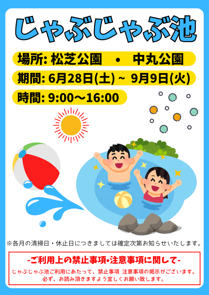 【松芝公園】・【中丸公園】じゃぶじゃぶ池 営業日のご案内