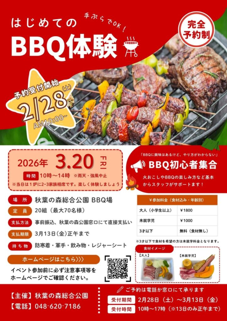 ・・・ お申し込み開始日時 2026年2月28日(土)午前10時〜 お申し込み方法 お電話 または 公園管理事務所窓口にて直接 参加費のお振込先等は、お電話にてご説明いたします。 048-620-7186 ※お申 […]