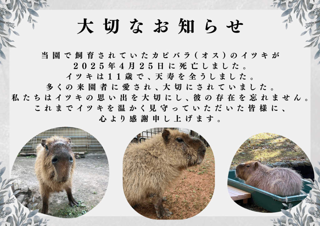 大崎公園で飼育されていたカピバラ(オス)のイツキが 2025年4月25日に死亡しました。 これまでイツキを温かく見守ってくださった皆様に、心より感謝申し上げます。