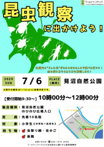 2025.06.25 イベント【見沼自然公園】『昆虫観察に出かけよう!7月版』開催のご案内見沼自然公園にて7月6日(日)に自然観察イベント『昆虫観察会に出かけよう!』を 開催致します!!🦋 公園内に”どんな虫”がいるのかを調べたり、虫の採り方やさわり方を解説します🐞 皆様のご参加を心よ […]