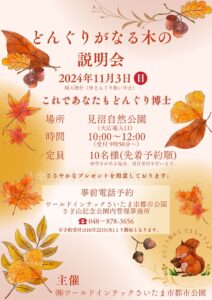 2024.10.17 イベント【11月3日(日)】見沼自然公園 『どんぐりのなる木の説明会』開催のお知らせ11月3日(日)より見沼自然公園にて、 『どんぐりがなる木の説明会』を開催いたします! 見沼自然公園内を散策しながら、 公園内のどんぐりの木について学べちゃうツアーになります♪ これであなたもどんぐり博士!! ぜ […]