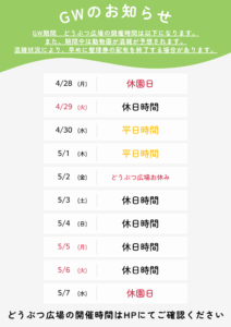 2025.04.26 おおさき公園からのお知らせ【大崎公園】 ゴールデンウィーク期間動物ひろば開催時間のお知らせゴールデンウィーク期間の動物ひろば開催時間は通常と変更になります。 また、期間中は混雑が予想されるため、混雑状況により早めに整理券の配布を終了する場合があります。