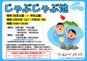 2024.06.29 お知らせ緑区 親水公園(松芝公園・中丸公園)じゃぶじゃぶ池 7月のご案内緑区公園 親水施設(じゃぶじゃぶ池)のご案内 各公園、各月清掃・地域行事等(お祭り)の為、お休みがあります。(下記7月日程)8月以降は分かり次第、お知らせいたします。 松芝公園 [開催期間]6月29日(土)か […]