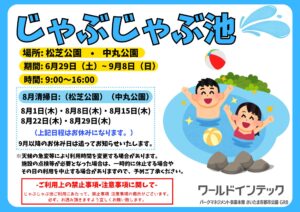2024.06.16 お知らせ大崎公園じゃぶじゃぶ池 利用可能期間のお知らせ2024年夏季のじゃぶじゃぶ池利用可能期間が以下の通り決まりました。 期間:7/13(土)〜9/1(日)まで時間:10:00〜16:00 期間中、以下の三日間は定期清掃のため利用不可となります。ご注意ください。定期清掃日 […]