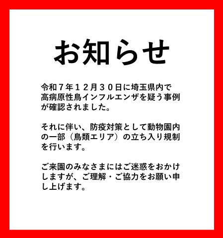 【令和8年1月2日(金)】子ども動物園 高病原性鳥インフルエンザ防疫対策の為、動物園内一部(鳥類エリア)の立入禁止のお知らせ