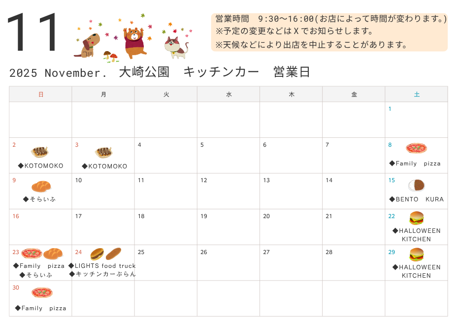 2025.10.28 *令和7年11月*キッチンカー出店スケジュールのご案内 大崎公園内にて、11月出店予定のキッチンカーをご案内いたします♪ 営業時間:9時30分~16時00分… Read More »