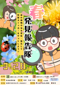 【見沼自然公園】『3/28(土)春の発見報告隊』開催のご案内2026.03.19 見沼自然公園にて3月28日(土)に自然観察イベント 《春の発見報告隊》を開催致します!! 春の植物や虫を発見・報告して、特製ステッカーをゲットしよう! さいたま市都市公園GR8 見沼自然公園管理事務所 ワールドインテ […]
