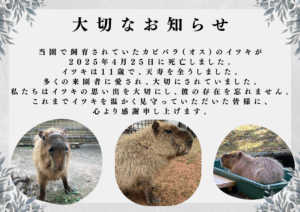 2025.04.26 おおさき公園のニュース【大切なお知らせ】 カピバラのイツキについて大崎公園で飼育されていたカピバラ(オス)のイツキが 2025年4月25日に死亡しました。 これまでイツキを温かく見守ってくださった皆様に、心より感謝申し上げます。