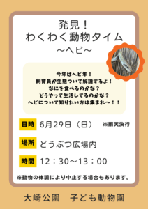 2025.06.29 おおさき公園からのお知らせ【こども動物園】わくわく動物タイム〜ヘビ〜