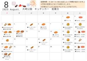 2025.07.28 おおさき公園からのお知らせ*令和7年8月*キッチンカー出店スケジュールのご案内大崎公園内にて、8月出店予定のキッチンカーをご案内いたします♪ 営業時間:9時30分~16時00分内 ※お店によって時間が変わります。 8月1日(金) [そらいふ] 8月2日(土) [ファミリーピザ] 8月3日(日) […]