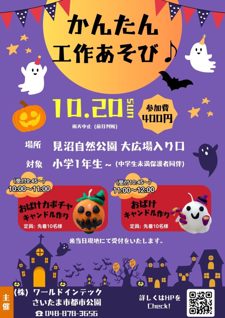 10月20日(日)より見沼自然公園にて、 『かんたん 工作あそび♪』を開催いたします! キャンドル粘土を使って”簡単に作れる” ハロウィンキャンドル作り体験です おばけカボチャ型とおばけ型の2種類 […]