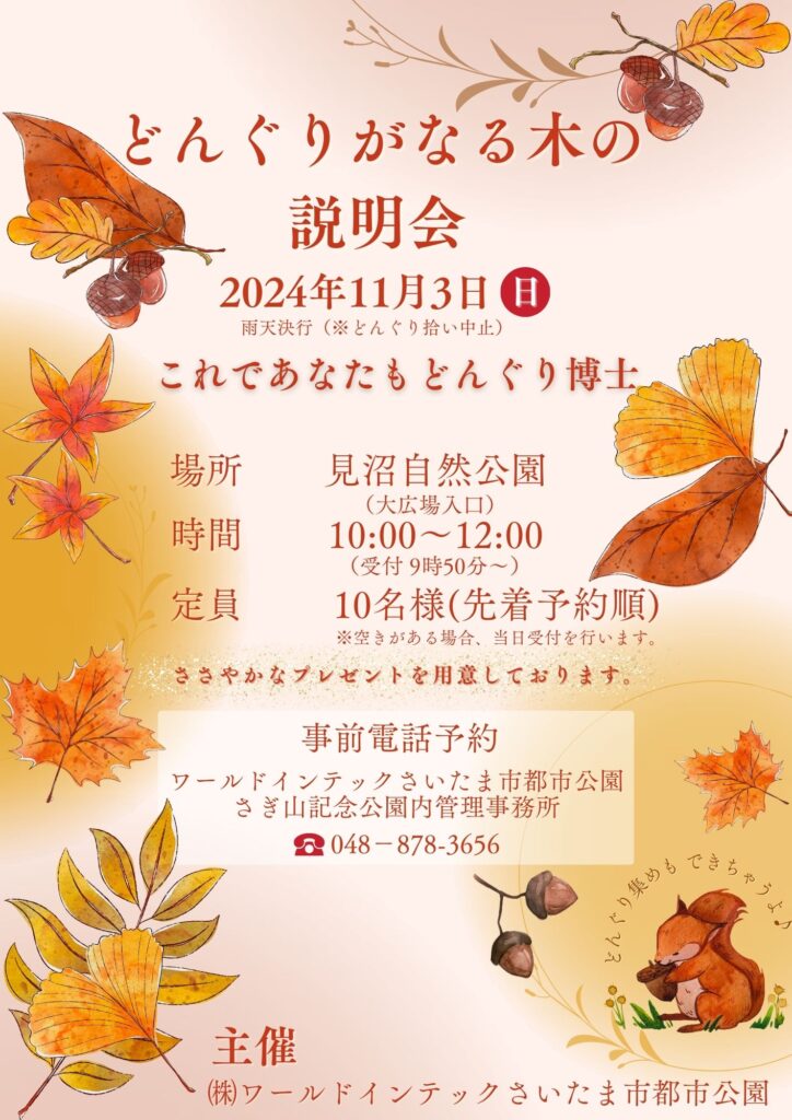 11月3日(日)より見沼自然公園にて、 『どんぐりがなる木の説明会』を開催いたします! 見沼自然公園内を散策しながら、 公園内のどんぐりの木について学べちゃうツアーになります♪ これであなたもどんぐり博士!! ぜ […]