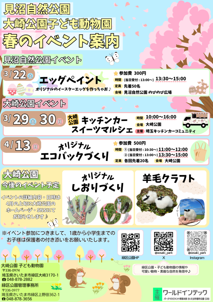見沼自然公園にて春イベントのご案内を致します! イースター祭りにちなみ、かわいい“たまご“を使った 工作体験イベントを開催します♪ パステルカラーのたまごに模様を描いたり、モールを使ってお耳をつけたり…🤔✨ ぜひこの機会 […]